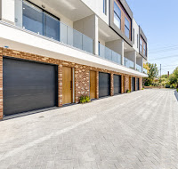 Architectural landscaping gardens design through the development with irrigation and charcoal paving in the private courtyard.